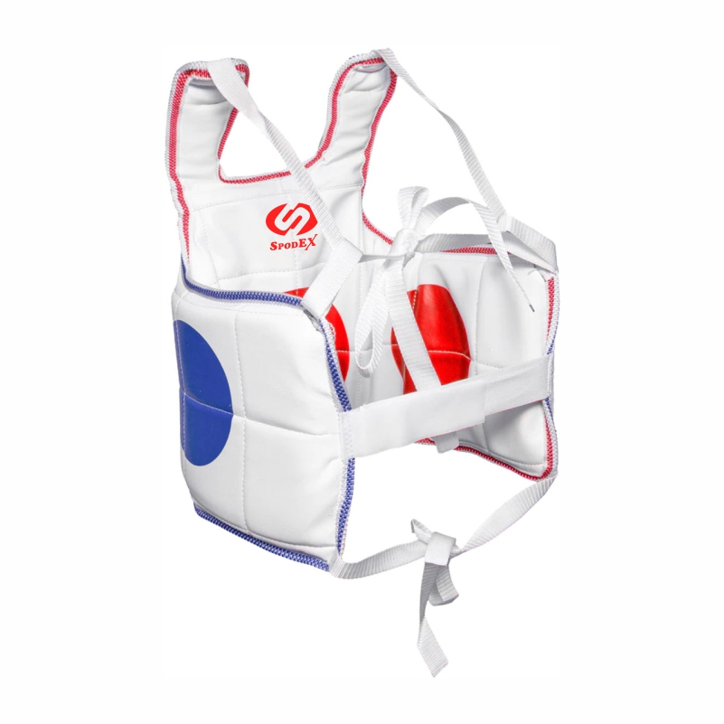 Built for performance and precision, the SPODEX reversible taekwondo chest protector provides dependable protection without restricting movement. Its shock-absorbing rubber padding disperses impact efficiently, while the tough synthetic leather exterior resists wear from daily training. Designed for dual use, one side features red scoring zones and the other blue, making it ideal for tournaments. Adjustable elastic shoulder straps and side ties ensure a snug, comfortable fit, while hook-and-loop fasteners keep it stable during intense sparring.