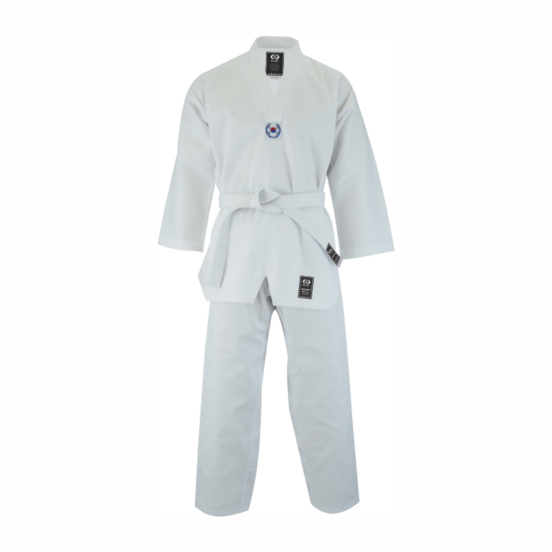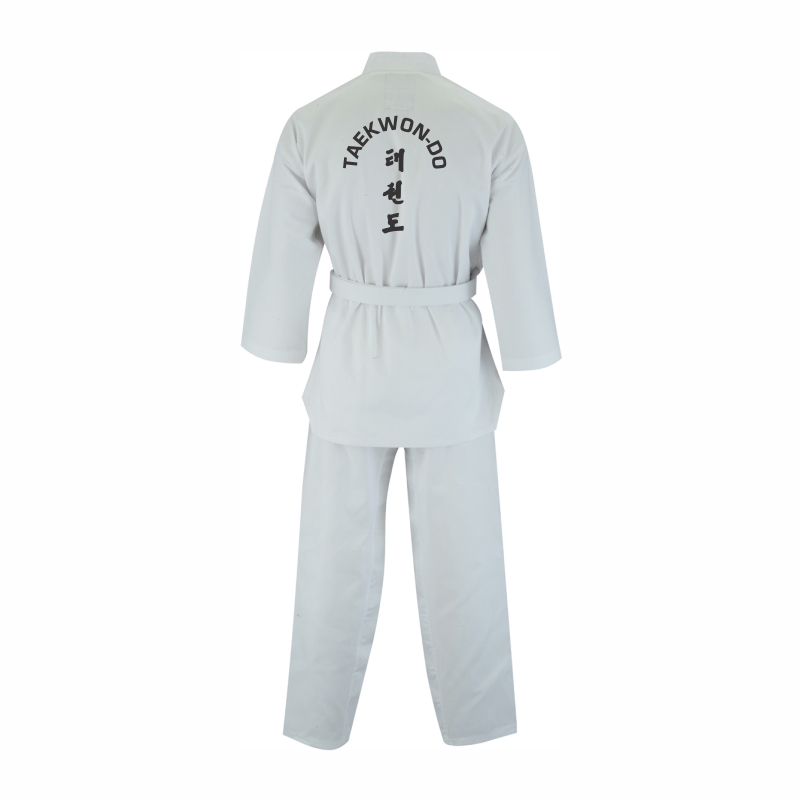 Perform at your best with our 8.5 oz taekwondo gi, made from a durable 65% polyester & 35% cotton blend. Designed with direct embroidery on the back, elasticated waistband trousers, drawstring fastening, and supplied with a separate white belt.